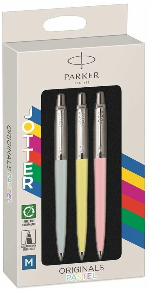 Set 3 penne a sfera Parker Jotter, colori pastello (rosa, azzurro e giallo), punta media, inchiostro blu. Questa gamma di penne a sfera Parker Jotter combina l’eccezionale silhouette di Jotter e il caratteristico pulsante a scatto con una palette di colori pastello, in linea con i trend del momento.