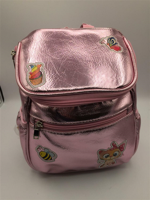 Stilosissimo Mini zaino targato Tinta Unita Pool Over in Similpelle Metallizzata con dei graziosi stickers sul davanti, una tasca grande e una piccola davanti, e due tasche laterali.