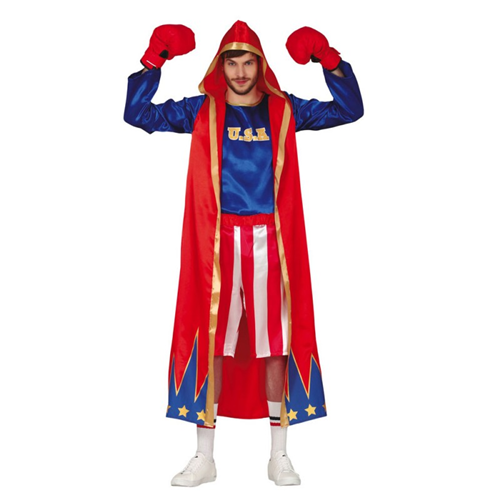Costume da pugile americano. Se il tuo idolo è Rocky Balboa o qualsiasi altro combattente, questo è il tuo modello. Con questo costume da boxer puoi salire sul ring e raddrizzare i chakra di quello davanti con il piede sinistro. Contiene: pantaloncini, t-shirt e vestaglia con cappuccio.