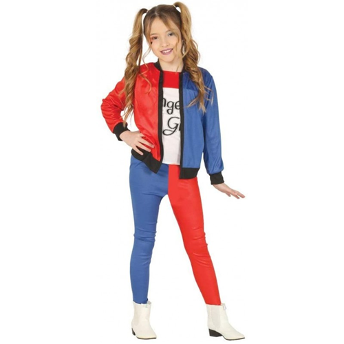 Bellissimo costume da Bambina Pericolosa, che ricorda la terribile Harley Quinn. La confezione comprende: giacca con maglietta e il pantalone.