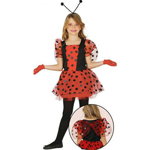 Costume da coccinella composto da abito in tessuto di colore rosso a pois neri, gonnellina arricchita da tulle, manica in veletto, cerchietto con antenne. Le ali sono cucite sul retro e sono dello tessuto velato della gonna e delle maniche (guanti e calze escluse). Disponibile in diverse taglie.