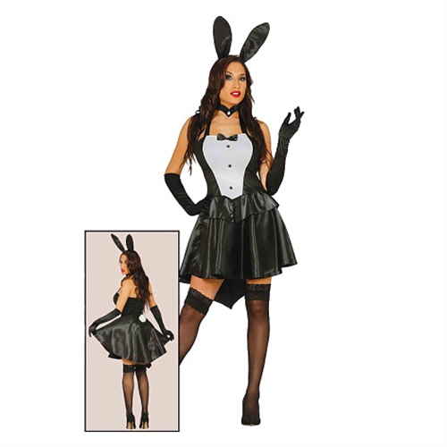 Costume da coniglietta composto da abito nero con codina bianca e cerchietto con orecchie. Sono esclusi i guanti e il collarino.