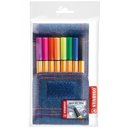 Astuccio in tessuto tipo denim. Può essere usato anche come porta cellulare Fineliner point 88 in formato MINI Supporto della punta in metallo per garantire una grande resistenza tratto da 0,4mm 8 colori assortiti (6 normali + 2 fluo)