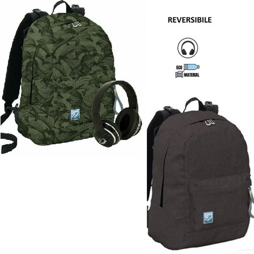Zaino Reversibile. Scomparto unico con tasca frontale applicata su entrambi i lati. Cuffie wireless incluse.