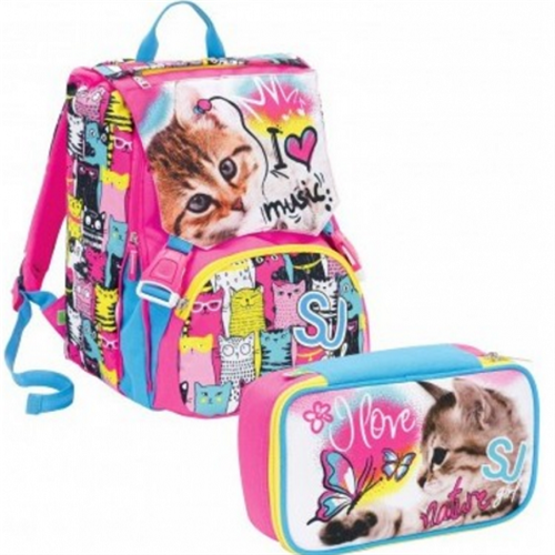 Lo School Pack comprende: 1 Zaino estensibile SJ ; 1 astuccio Quick Case contenente: 1 penna cancellabile Frixion blu; 1 penna Tratto rossa; 18 pennarelli Giotto Turbo Color; 18 colori a matita Giotto Supermina; 1 matita Lyra HB; 1 colla stick Pritt; 1 gomma; 1 temperino; 1 righello; 1 goniometro, 1 paio di forbici.
