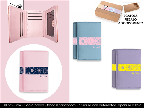 Portafoglio in finta pelle PU marchiato MOOD MILANO. 12,5x8,5 cm. Portafoglio compatto con design MAIOLICA. All'interno 7 tasche porta card, tasca contanti, chiusura con automatico. Apertura a libro. Con scatola personalizzata.