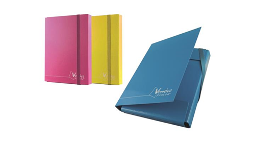 Con elastico piatto in tinta. Formato 260 x 340 x 30 mm, in cartone da 1,7 mm, plastificato lucido e rivestito. Disponibile in 6 colori vivaci assortiti, resistente ai liquidi, superficie scrivibile