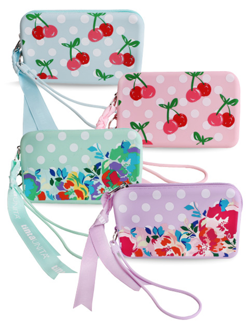 Busta rettangolare con laccetto da polso in silicone, sempre a portata di mano.