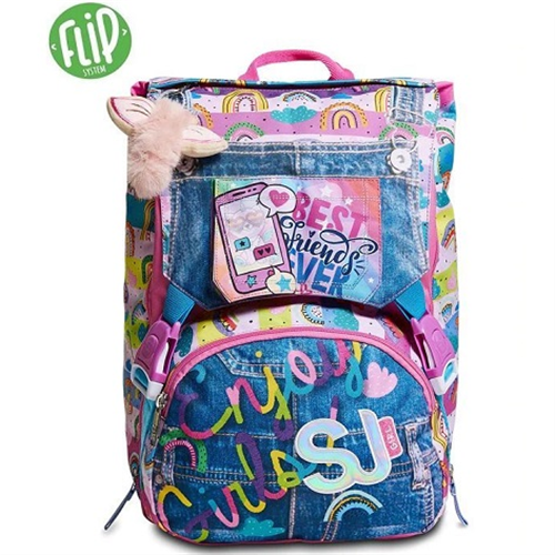 Ciao! Sono il sorprendente zaino estensibile SJ Gang! Mi piace unire il gioco e la comodità per affrontare insieme a te la scuola con spensieratezza. Sono dotato di FLIP SYSTEM: un sistema di pattine sfogliabili con grafiche diverse. Divertiti a scoprire qual è quella in tessuto lenticolare! Ti sembrerà di avere uno zaino sempre diverso! Ho un ampio doppio scomparto, la cui capienza si può facilmente moltiplicare grazie alle zip laterali per poter accogliere e distribuire in modo ottimale anche i carichi più pesanti. Con lo schienale Ergosystem preformato e gli spallacci imbottiti e traspiranti sono comodo da indossare sulle spalle, mentre il fondo integrato fa sì che la mia struttura rimanga inalterata e stabile anche a pieno carico. Caratteristiche Tecniche Schienale Ergosystem preformato con fondo integrato Capacità 21 LT - 28 LT Dimensioni 27 x 41 x 16 (+6) cm Altre caratteristiche Zaino doppio scomparto estensibile tramite zip laterali. Inserti rifrangenti per protezione a 360°. Flip System su pattina con immagine in tessuto lenticolare. Elastico per capelli. Tasche Tasca frontale. Tasca su pattina. Spallacci Imbottiti e rivestiti in tessuto e rete traspirante Tessuto Poliesteree flip system con materiale lenticolare