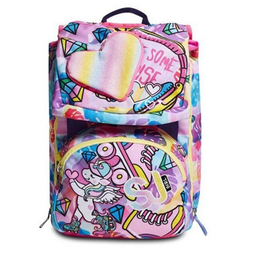 Ciao! Sono il sorprendente zaino estensibile SJ Gang! Scopri il mio nuovo LOAD CONTROL SYSTEM: è un sistema di regolazione integrato per bilanciare il peso all’interno dello zaino, facendolo aderire meglio alla schiena. In questo modo avrai una maggiore sensazione di comfort ed equilibrio! Sono dotato di una taschina zip a forma di cuore sulla pattina superiore e ho un ampio doppio scomparto, la cui capienza si può facilmente moltiplicare grazie alle zip laterali. Con lo schienale Ergosystem preformato e gli spallacci imbottiti e traspiranti sono comodo da indossare sulle spalle, mentre il fondo integrato fa sì che la mia struttura rimanga inalterata e stabile anche a pieno carico. Caratteristiche Tecniche Schienale Ergosystem preformato con fondo integrato Capacità 21 LT - 28 LT Dimensioni 27 x 41 x 16 (+6) cm cm Altre caratteristiche Zaino doppio scomparto estensibile tramite zip laterali. Nuovo sistema di bilanciamento del carico. Inserti rifrangenti per protezione a 360°. Cuore sagomato sulla pattina porta monete. Tasche Tasca frontale. Tasca su pattina. Spallacci Imbottiti e rivestiti in tessuto e rete traspirante Tessuto Poliestere con tessuto glitter
