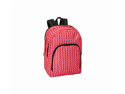 Zaino organizzato con triplo scomparto con alloggio porta PC. Schienale imbottito e rinforzato, spallacci imbottiti e regolabili. Maxi tasca frontale con zip. Collezione All Over in poliestere alta densità, con etichetta e tirazip in metallo cromato con logo forato e inciso. Dimensioni: 31 x 42 x 19,5cm
