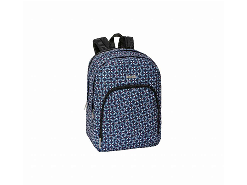 Zaino organizzato con triplo scomparto con alloggio porta PC. Schienale imbottito e rinforzato, spallacci imbottiti e regolabili. Maxi tasca frontale con zip. Collezione All Over in poliestere alta densità, con etichetta e tirazip in metallo cromato con logo forato e inciso. Dimensioni: 31 x 42 x 19,5cm