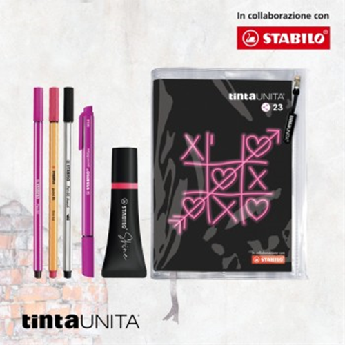 L'esclusivo diario TintaUNITA in collaborazione con Stabilo è accompagnato da un set di prodotti Stabilo all'interno di una copertina con zip in plastica dove potrai inserire anche il tuo smartphone.