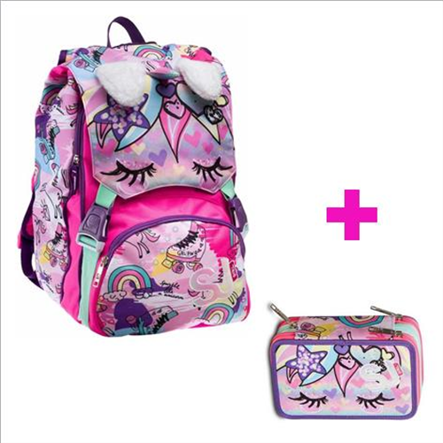 Zaino doppio scomparto estensibile tramite zip laterali. Orecchie plushy con interno glitter sollevabili tramite sistema ad aria dallo spallaccio a pressione e applicazione in raso su pattina.