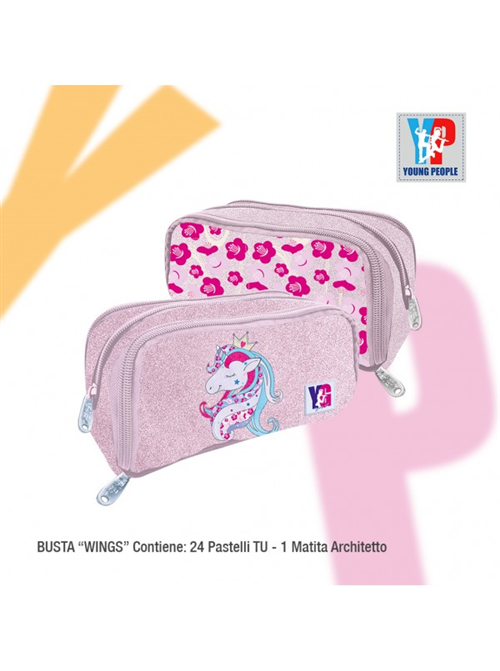 Bustina Wings 3 zip glitter Unicorno Young People 2022/2023 - con 24 pastelli TintaUnita - rosa