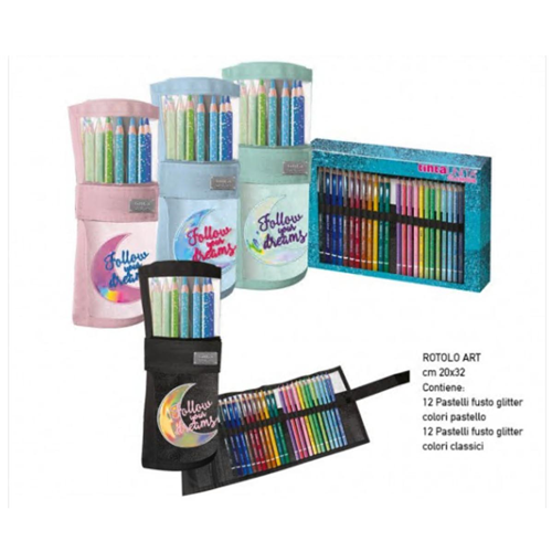 Astuccio a rotolo TintaUnita Glamour 2022/2023 - contiene 24 Pastelli TintaUnita con il fusto glitterato, di cui 12 colori classici e 12 colori pastel - azzurro