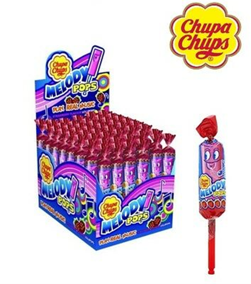 Chupa Chups Melody Pops, grazioso lecca lecca al sapore Fragola con all'interno un divertente fischietto. Unisce il gusto del Chupa Chups al divertimento della musica.
