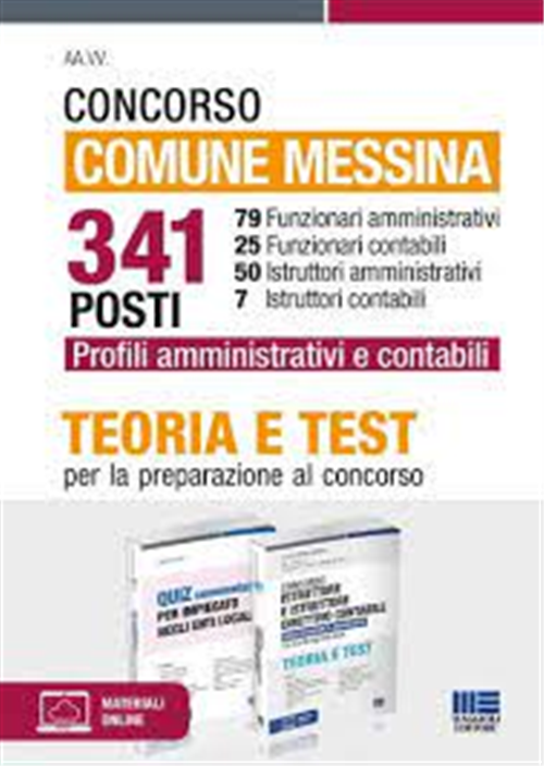 Il presente kit è un utile strumento di preparazione ai concorsi indetti dal Comune di Messina per 341 posti suddivisi in vari profili. In particolare è un completo supporto allo studio per le prove concorsuali per i seguenti profili: 79 FUNZIONARI amministrativi; 25 FUNZIONARI contabili; 50 ISTRUTTORI amministrativi; 7 ISTRUTTORI contabili. Il Kit comprende:: il manuale "Istruttore e Istruttore direttivo contabile"; la raccolta "Quiz commentati per impiegato negli enti locali". Grazie allo studio sul manuale e al ripasso e verifica attraverso l'esercizio dei quiz i candidati completeranno la propria preparazione su: Diritto costituzionale; Diritto amministrativo; Pubblico Impiego; Accesso agli atti; Anticorruzione e trasparenza; > Ordinamento istituzionale, finanziario e contabile degli enti locali; Contratti pubblici; Diritto penale e reati contro la P.A.; Privacy. Disponibili nella sezione online, raggiungibile seguendo le istruzioni sul retro, i seguenti materiali: Simulatore di quiz; Quiz di lingua inglese; Teoria e quiz di informatica.
