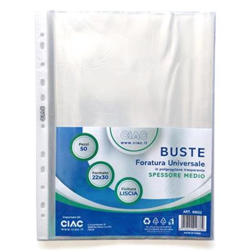 Buste forate realizzate in Naturene (polipropilene) trasparente liscio con foratura universale. Tipologia linear 22x30cm. Confezione da 50 buste.