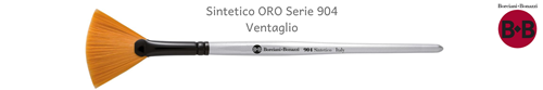 Pennello con punta a ventaglio in filato sintetico Oro, con manico corto in legno sagomato laccato color argento, con ghiera in alluminio anodizzato tinto nero.