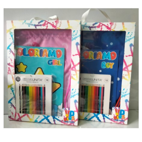 Set regalo contenente zainetto a sacca, album da colorare e 18 pastelli colorati Tinta Unita con mina da 4.0 mm.