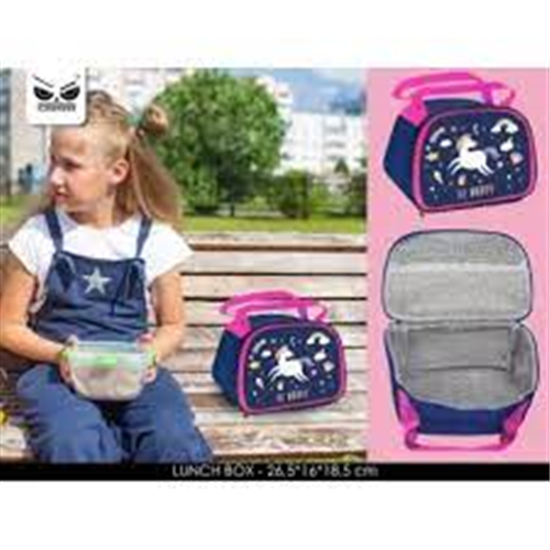26,5 x 16 x 18,5 cm. Borsa porta pranzo con 5/6 ore di mantenimento della temperatura. PU sul fronte, interno in poliestere. Con chiusura zip.