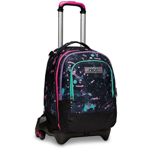 Trolley scomponibile con sistema a 3 ruote. Crossover System con clips per l'aggancio dei nastri, doppia barra telescopica con due regolazioni in altezza. Fondo rinforzato e protezioni angolari. 3 possibili utilizzi: 1) uso trolley con spallacci a scomparsa totale nello schienale. 2) uso zaino senza sganciare il carrello. 3) uso zaino quando completamente sganciato dal carrello. Zip con dentini in argento e nuova etichetta in gomma personalizzata con logo SEVEN.