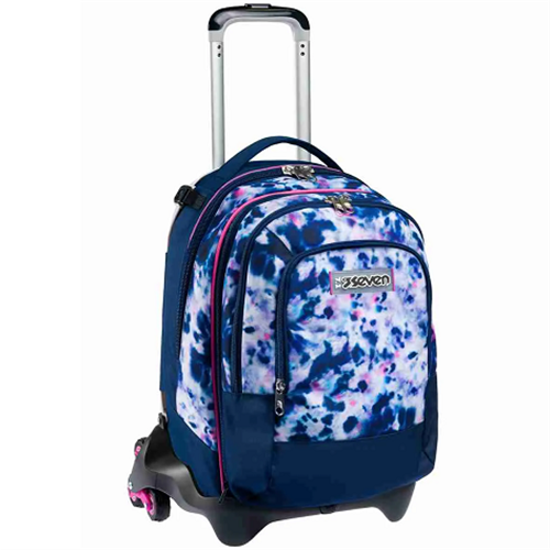 Trolley scomponibile con sistema a 3 ruote. Crossover System con clips per l'aggancio dei nastri, doppia barra telescopica con due regolazioni in altezza. Fondo rinforzato e protezioni angolari. 3 possibili utilizzi: 1) uso trolley con spallacci a scomparsa totale nello schienale. 2) uso zaino senza sganciare il carrello. 3) uso zaino quando completamente sganciato dal carrello. Zip con dentini in argento e nuova etichetta in gomma personalizzata con logo SEVEN.