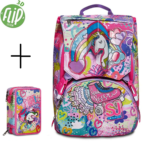 Ciao! Sono MAGICFLIP GIRL, lo zaino estensibile SJ GANG con cui vai a scuola, ma puoi anche giocare. Grazie al mio FLIP SYSTEM, infatti, puoi divertirti a cambiarmi aspetto sfogliando le pattine ogni volta che vuoi! E sulla pattina in 3D vedrai spuntare un bellissimo skateboard! Ho un doppio scomparto spazioso, di cui puoi aumentare facilmente la capienza tramite le zip laterali per poter accogliere e distribuire in modo ottimale libri, quaderni e tutto ciò che ti serve per la tua giornata, potendo sfruttare anche la tasca frontale. Inoltre sono davvero comodo da indossare sulle spalle, grazie a schienale e spallacci confortevoli. In più, il fondo integrato mantiene la mia struttura inalterata, garantendo la stabilità del contenuto anche a pieno carico.
