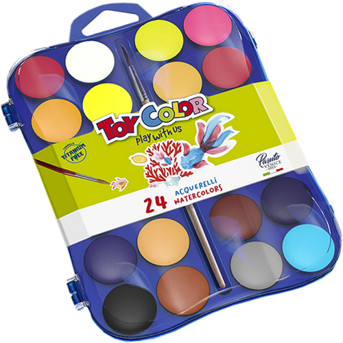 Gli acquerelli Toy Color sono made in Italy, hanno un sistema produttivo in forma liquida, esclusivo di Pasuto, offrono una texture cremosa, una resa cromatica eccezionale e permettono di creare infinite sfumature. Le pastiglie hanno diametro 30 mm. Il coperchio è stato progettato per diventare una tavolozza grazie alle sue concavità.