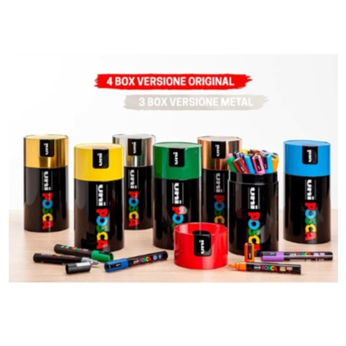 Il pennarello Uni Posca PC5 con la sua punta media da 2,5 mm, si presenta nella sua Nuovissima Gift Box eco friendly riciclabile all’infinito, confezionata in una elegantissima scatola nera, 0% di utilizzo plastica, composta da 18 colori assortiti. Apprezzato tanto dai professionisti quanto dagli appassionati permette di tracciare un tratto netto e preciso, ma anche di realizzare le più belle decorazioni. Permanente sulle superfici porose irregolari come legno, pietra, calcestruzzo, cancellabile sulla maggior parte dei materiali lisci non porosi. E’ possibile usare una vernice trasparente fissativa per la protezione delle decorazioni. A base d’acqua, acquerellabile, sovrapponibile con punta lavabile e reversibile. La confezione in alluminio è disponibile in 7 diversi colori: rosso, giallo, verde, azzurro, oro, argento e bronzo