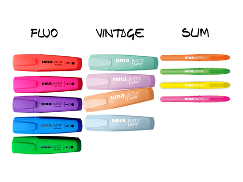 In colori fluo e pastello, disponibile oltre la vendita singola anche in pack acetato e basetta porta evidenziatori, da 6, 12 o 18 colori.