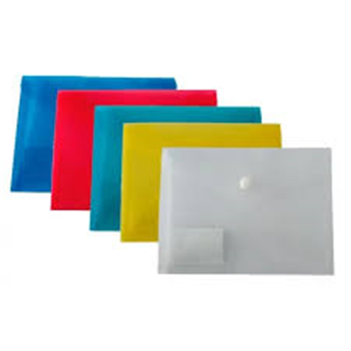 Busta con chiusura a bottone, colori coprenti. Formato utile busta: A4. Dimensione busta: 33x24cm.