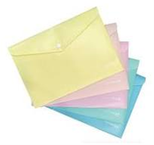 Busta con chiusura a bottone, coprente, colori pastello. Formato utile busta: A5. Dimensione busta: 24x17cm.