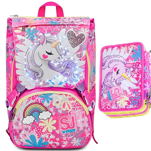 Ciao! Sono UNICORN LED, lo zaino estensibile SJ GANG con cui vai a scuola, ma puoi anche giocare. Infatti puoi divertirti a illuminare tutte le volte che vuoi il fantastico unicorno sulla pattina staccabile attivando il dispositivo luminoso effetto “lighting stitch” tramite pulsante ON/OFF! Ho un doppio scomparto spazioso, di cui puoi aumentare facilmente la capienza tramite le zip laterali per poter accogliere e distribuire in modo ottimale libri, quaderni e tutto ciò che ti serve per la tua giornata, potendo sfruttare anche la tasca frontale e la tasca porta borraccia. Inoltre, sono davvero comodo da indossare sulle spalle, grazie a schienale e spallacci confortevoli. In più, il fondo integrato mantiene la mia struttura inalterata, garantendo la stabilità del contenuto anche a pieno carico.