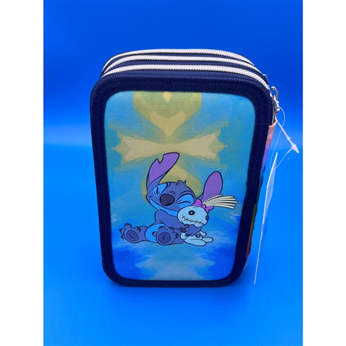 L’astuccio Stitch 3 Zip ha tre scomparti in cui troverai tutto il materiale necessario per la tua giornata di scuola. Contenuto 45 pezzi: -1 penna cancellabile colore blu -1 penna a sfera colore rosso -18 pennarelli -18 pastelli a colori -1 matite grafite -1 colla stick -1 gomma -1 temperino -1 righello trasparente -1 goniometro trasparente -1 forbice in metallo con maniglia in plastica
