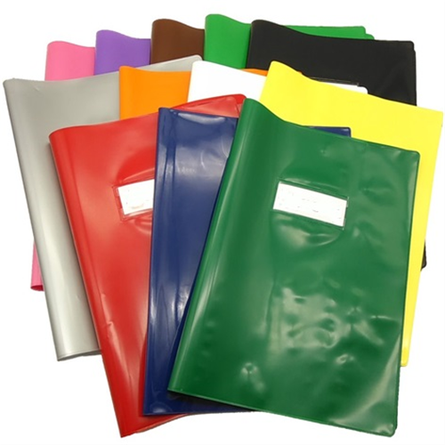 Copertina per quadernoni coprente in PVC 220µ. Munita di etichetta rimovibile e alette interne.