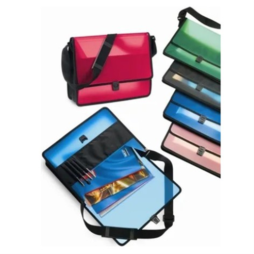 PORTABLOCCO IN PP SEMITRASPARENTE CON TRACOLLA E PATELLA, TASCA FRONTALE PORTAOGGETTI, SOFFIETTO E BORDATURE IN TESSUTO. DIM.CM. 27X39X10