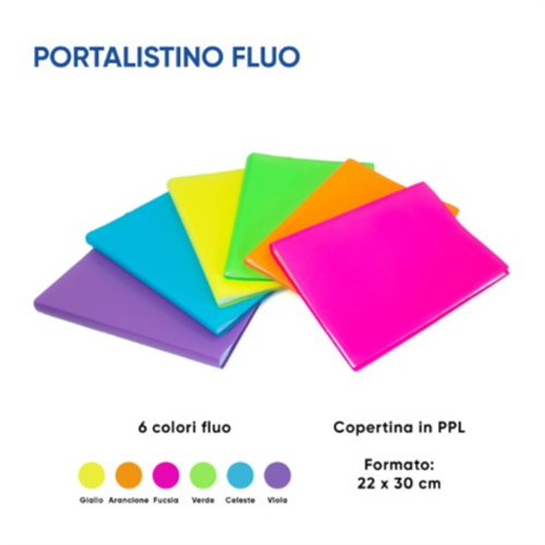 Porta listino 22 X 30 cm in PPL in 6 colori fluo assortiti.