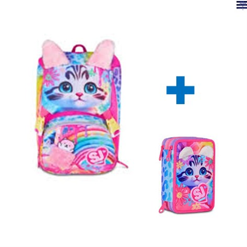 Ciao! Sono CAT&AIR, lo zaino estensibile SJ GANG con cui vai a scuola e con cui puoi giocare facendo sollevare le mie ORECCHIE DI PELUCHE! Ho un doppio scomparto spazioso, di cui puoi aumentare facilmente la capienza tramite le zip laterali per poter accogliere e distribuire in modo ottimale libri, quaderni e tutto ciò che ti serve per la tua giornata, potendo sfruttare anche la tasca frontale con dettaglio taschino e MINI PELUCHE in applicazione. Inoltre, sono davvero comodo da indossare sulle spalle, grazie a schienale e spallacci confortevoli. In più, il fondo integrato mantiene la mia struttura inalterata, garantendo la stabilità del contenuto anche a pieno carico.