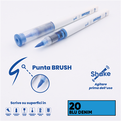 Marcatore a tempera con punta brush, scrive su tessuto, plastica, vetro, ceramica, metallo, legno. Agitare prima dell'uso.