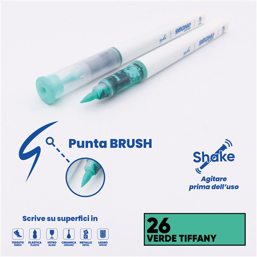 Marcatore a tempera con punta brush, scrive su tessuto, plastica, vetro, ceramica, metallo, legno. Agitare prima dell'uso.
