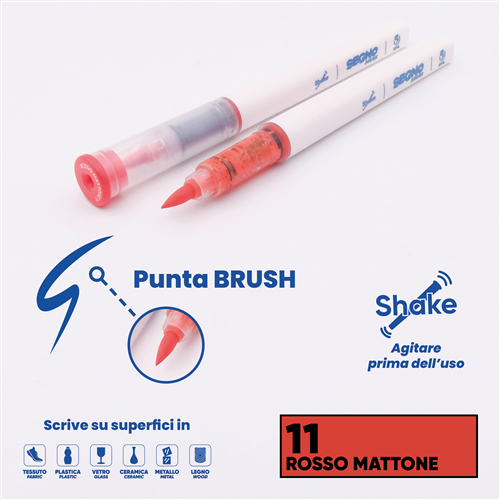 Marcatore a tempera con punta brush, scrive su tessuto, plastica, vetro, ceramica, metallo, legno. Agitare prima dell'uso.