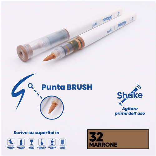 Marcatore a tempera con punta brush, scrive su tessuto, plastica, vetro, ceramica, metallo, legno. Agitare prima dell'uso.