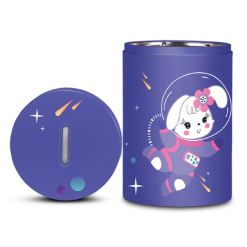 Salvadanaio in latta, leggero e resistente, per iniziare i più piccoli al risparmio. Rimuovendo il coperchio superiore può essere utilizzato anche come portamatite.