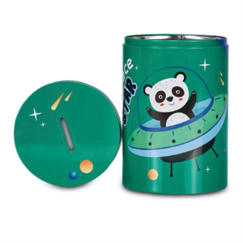 Salvadanaio in latta, leggero e resistente, per iniziare i più piccoli al risparmio. Rimuovendo il coperchio superiore può essere utilizzato anche come portamatite.