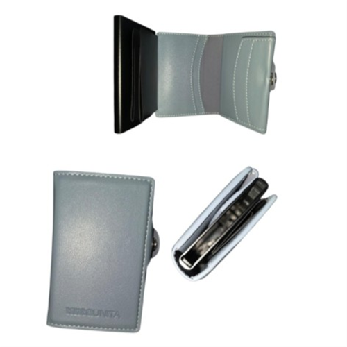 Il portafoglio ha una chiusura con bottone per una maggiore sicurezza, scomparto porta banconote, tasche porta documenti e zona portacarte con sistema di estrazione a scatto tramite pulsante a scorrimento.