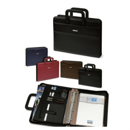 Cartella portablocco "PROFESSIONAL" in similpelle morbido colorato, con cerniera, manici rientranti, interno in tessuto a righe con varie tasche, anelli metallici Ø 3,5 cm., compreso di blocco.