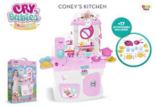 Impara a cucinare con Coney e la cucina Cry Babies: usa il forno, il frigorifero, il frullatore, il piano cottura e gioca con rubinetti e mensole in tanti modi diversi. Facile da assemblare. Può essere assemblato in 3 modi diversi ed ha oltre 17 accessori.