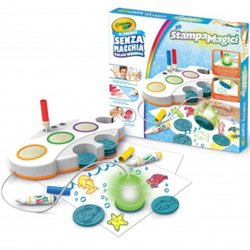 Gli stampa magici Gli stampa magici Color Wonder uniscono uno dei giochi preferiti dei bambini, gli stampini, con la necessità delle mamme di non sporcare perchè gli inchiostri sono trasparenti e acquistano colore solo sull'apposita carta Color Wonder e NON su pelle, mobili e tessuti! E' semplice e divertente: basta scegliere un colore, premere lo stampino sul tampone e osservare la manopola illuminarsi del colore scelto come per magia! Tanti stampini intercambiabili tematizzati mondo marino! Ideali per bambini dai 3+ Contenuto: Unità gli Stampa magici 3 tamponi d'inchiostro Color Wonder 3 pennarelli Color Wonder 10 stampini a tema marino Album Color Wonder 12 pagine